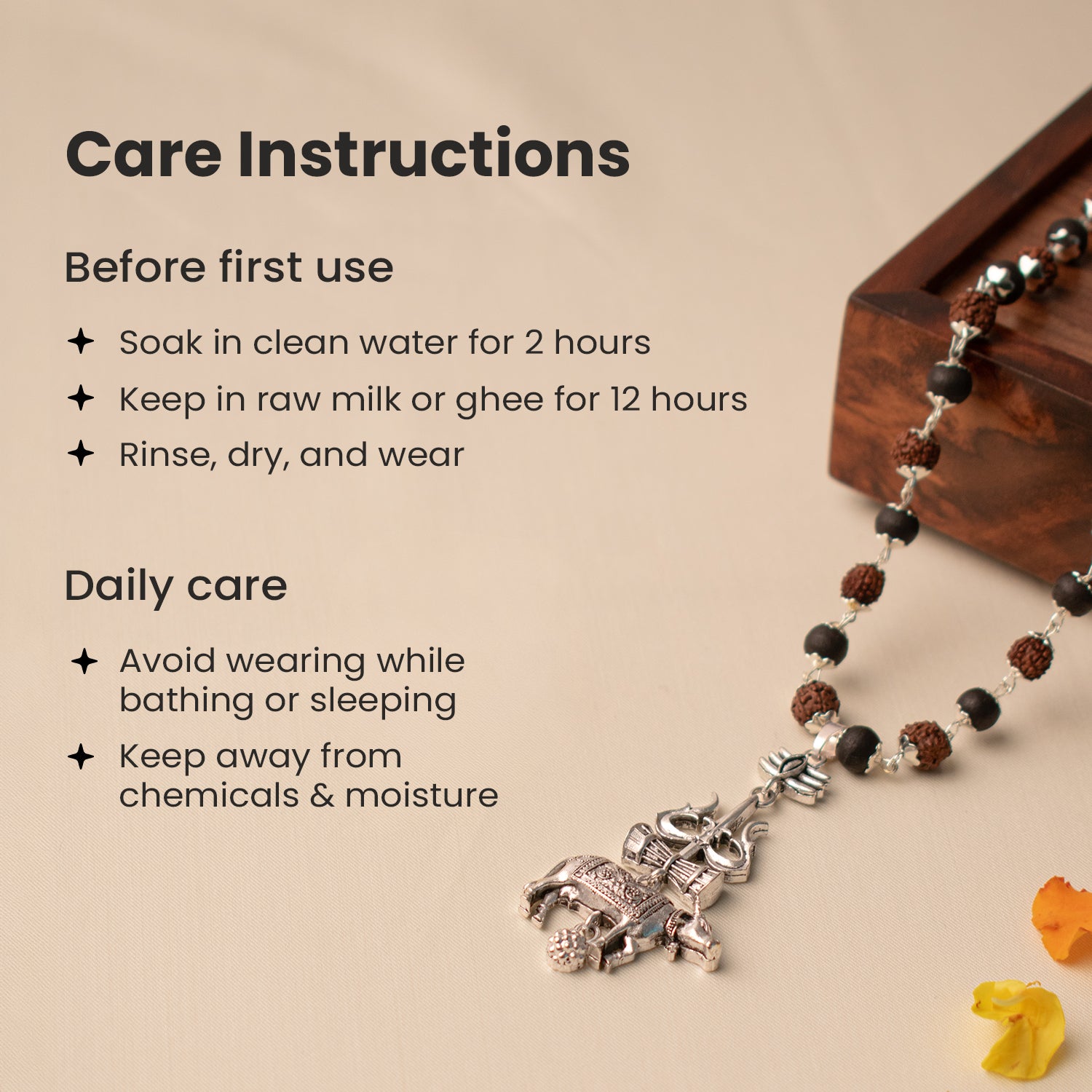 At the centre, the mala features a silver-plated Trishul Nandi pendant. The Trishul symbolises Lord Shiva’s strength, protection, and courage, while Nandi, his divine companion, represents faith, patience, discipline, and devotion. Together, they inspire you to stay steady, fearless, and spiritually connected to Lord Shiva in everyday life.