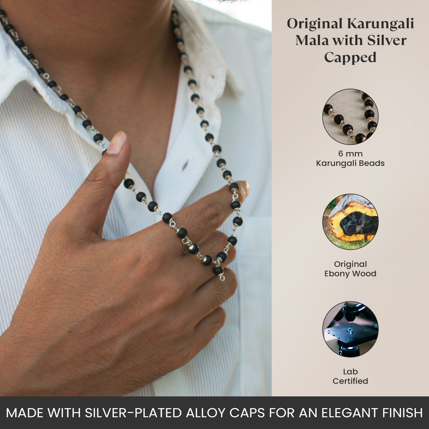 Embrace divine strength with our Silver Capped Karungali Mala, hand-carved from pure Black Ebony (Karungali) wood and silver-capped for purity and power. Known for generations in South Indian tradition, Karungali absorbs negativity, protects your aura, and connects you to the blessings of Lord Murugan.