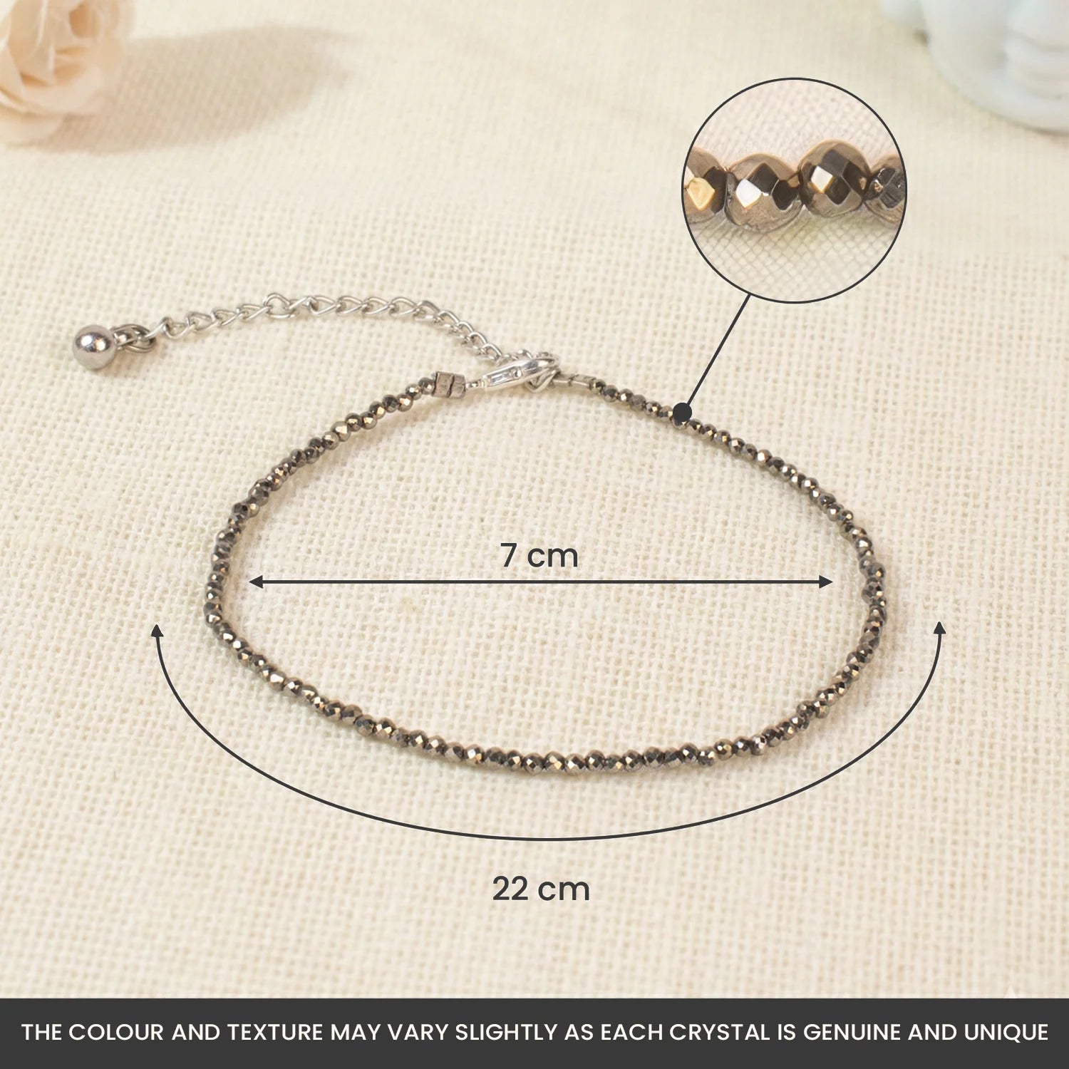 𝗔𝗻𝗸𝗹𝗲𝘁 – The diameter of the anklet is 𝟳 𝗰𝗺, with a circumference of 𝟮𝟮 𝗰𝗺. It also comes with an 𝗮𝗱𝗷𝘂𝘀𝘁𝗮𝗯𝗹𝗲 𝗵𝗼𝗼𝗸.