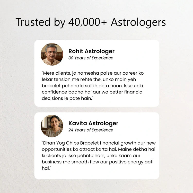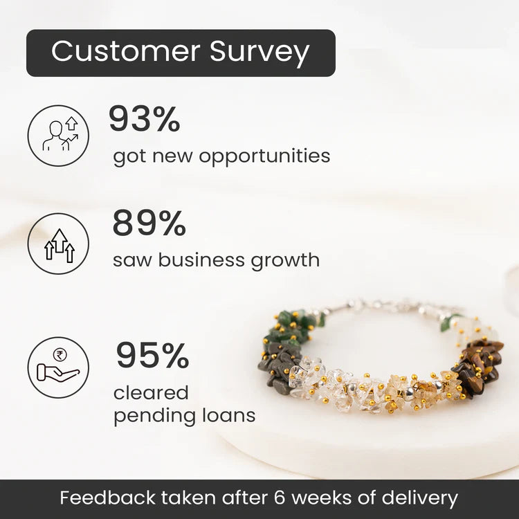 • Dhan Yog Chips Bracelet: A powerful blend of prosperity crystals. Pyrite attracts wealth and protects from negativity. Tiger Eye builds confidence and courage. Citrine supports smart money and career choices. Quartz boosts overall energy and clarity. Green Aventurine removes obstacles and opens new opportunities.