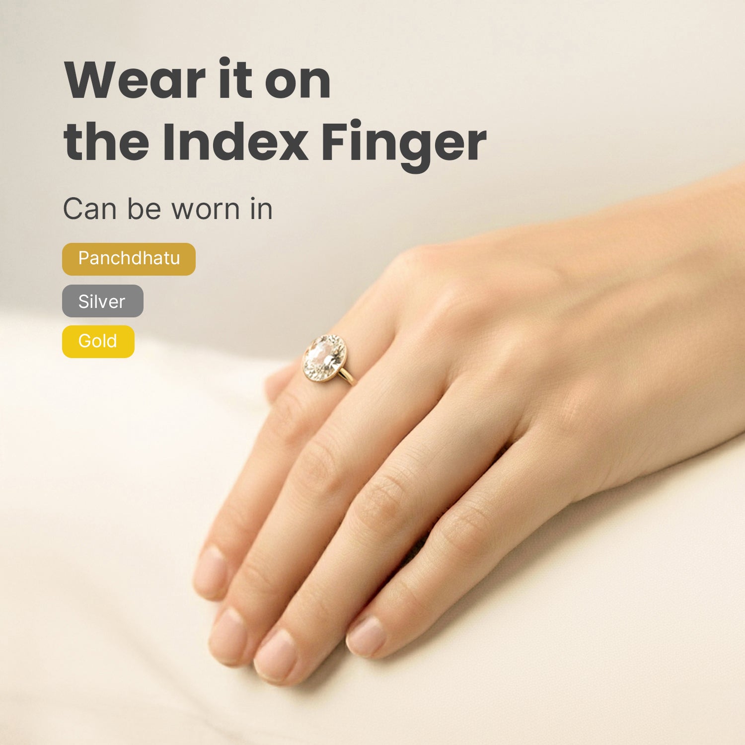 White Topaz is usually worn in Gold, Silver, or Panchdhatu rings or pendants. Panchdhatu metal can lose color with frequent contact with water, sweat, or perfume. Keep the ring dry to maintain its shine for a longer time.